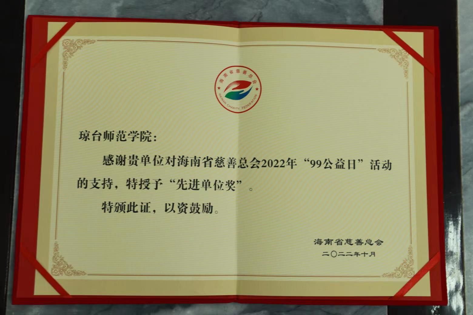 2022年10月28日在海口召开的海南省慈善总会2022年“99公益日”活动总结表彰大会上,琼台师范学院被授予“先进单位奖”。