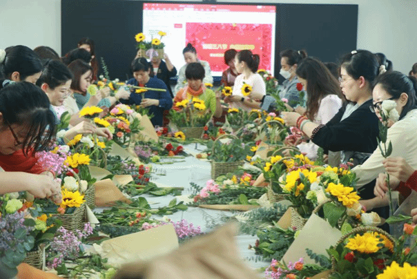 活动中,大家大胆发挥想象,用灵巧的双手,将百合、玫瑰、康乃馨、勿忘我等多种花材,进行修剪、整枝,再根据不同的色彩、形状有层次的搭配在一起,制作出了一篮篮形态各异、娇艳欲滴,象征着祝福与美好的插花作品。